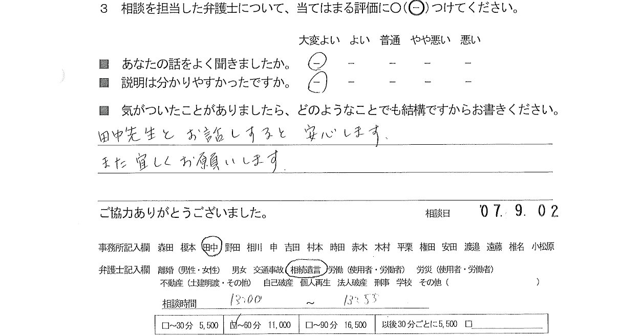 お客様の声(ご相談者の声)評判・口コミ 公開日:2025/10/23 お客様の声 ■年代 ■担当弁護士 ■あなたの話をよく聞きましたか ■説明はわかりやすかったですか - 田中 智美 大変よい 大変よい 田中先生とお話しすると安心します。また宜しくお願いします。 「お客様の声(ご相談者の声)評判・口コミ」 「お客様の声(ご相談者の声)評判・口コミ」