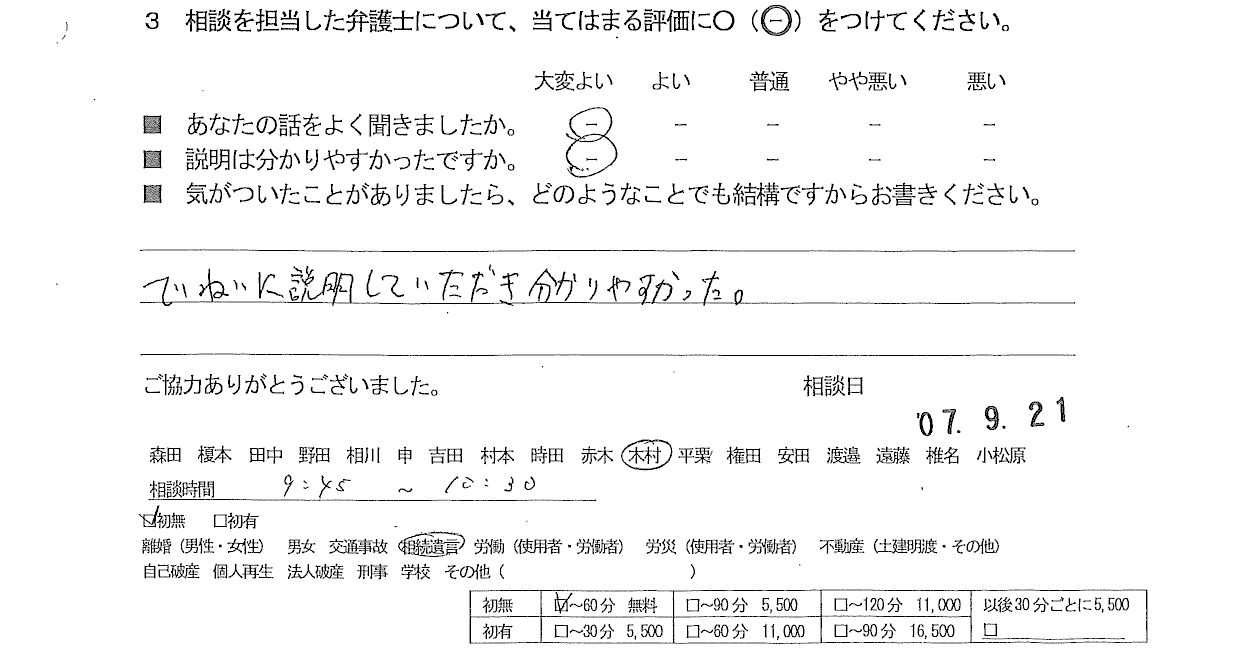 お客様の声(ご相談者の声)評判・口コミ 公開日:2025/10/23 お客様の声 ■年代 ■担当弁護士 ■あなたの話をよく聞きましたか ■説明はわかりやすかったですか - 木村 綾菜 大変よい 大変よい ていねいに説明していただき分かりやすかった。 「お客様の声(ご相談者の声)評判・口コミ」 「お客様の声(ご相談者の声)評判・口コミ」