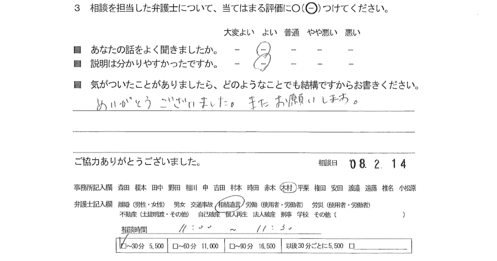 お客様の声(ご相談者の声)評判・口コミ 公開日:2026/03/17 お客様の声 ■担当弁護士 木村 綾菜 ■あなたの話をよく聞きましたか よい ■説明はわかりやすかったですか よい ありがとうございました。またお願いします。 関連記事: お客様の声 お客様の声16 お客様の声(ご依頼者の声)評判・口コミ お客様の声(ご相談者の声)評判・口コミ 「お客様の声(ご相談者の声)評判・口コミ」 「お客様の声(ご依頼者の声)評判・口コミ」