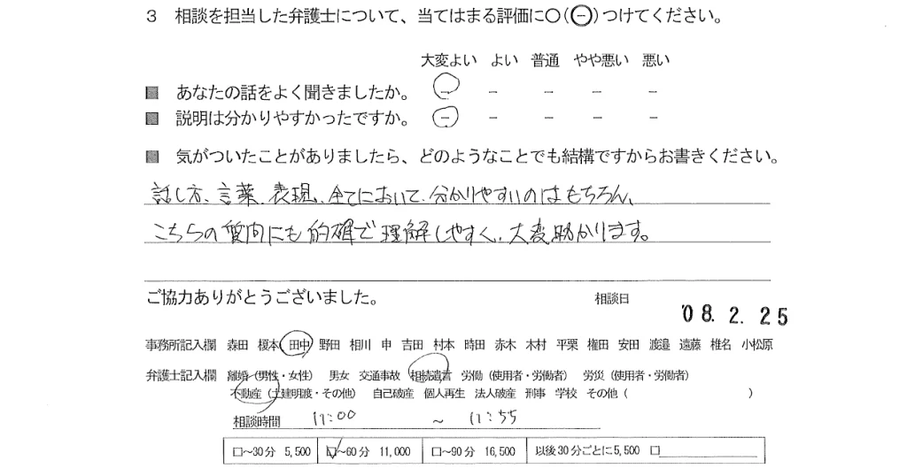お客様の声(ご相談者の声)評判・口コミ 公開日:2026/03/17 お客様の声 ■担当弁護士 田中 智美 ■あなたの話をよく聞きましたか 大変よい ■説明はわかりやすかったですか 大変よい 話し方、言葉、表現、全てにおいて、分かりやすいのはもちろん、こちらの質問にも的確で理解しやすく、大変助かります。 関連記事: お客様の声(ご依頼者の声)口コミ・評判 お客様の声(ご依頼者の声)口コミ・評判 お客様の声(ご依頼者の声)評判・口コミ お客様の声(ご相談者の声)評判・口コミ 「お客様の声(ご相談者の声)評判・口コミ」 「お客様の声(ご相談者の声)評判・口コミ」